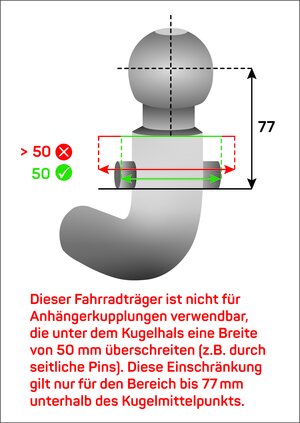 Maximale Zuladung SL = Stützlast Die Stützlast ist ein Indikator für die Belastbarkeit der Anhängerkupplung.Die eingetragene Stützlast ist im Fahrzeugschein unter Punkt 13 zu finden und muss zwingend eingehalten werden. Die Stützlast ist immer Fahrzeugabhängig und kann daher von Modell zu Modell variieren. Nicht relevant für Heckklappenträger | Stützlast - Eigengewicht (Kupplungsträger) = max. Zuladung Achtung: Maximale Zuladung des Kupplungsträgers beachten. Zu beachten ist, dass der Hals unterhalb der Kupplungskugel einen Durchmesser von mindestens 28,5mm haben muss. |